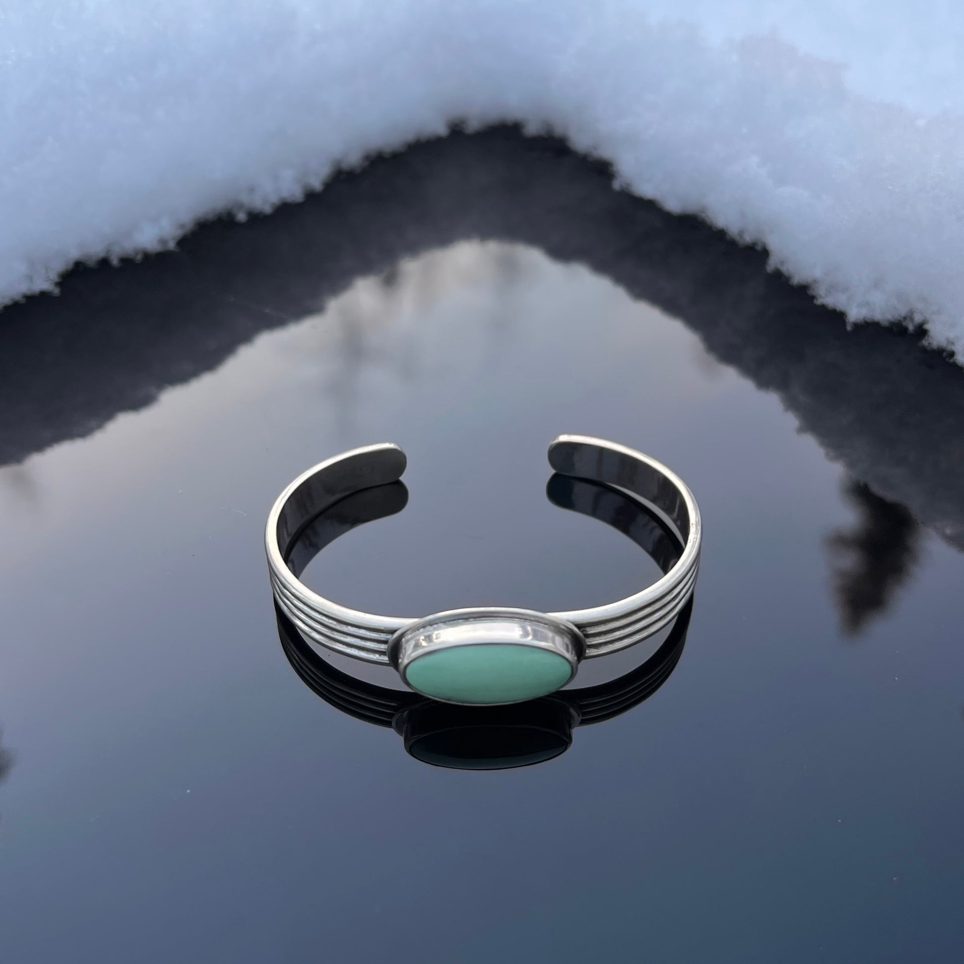 A heavy banded cuff with a milky green Desert Bloom Variscite.