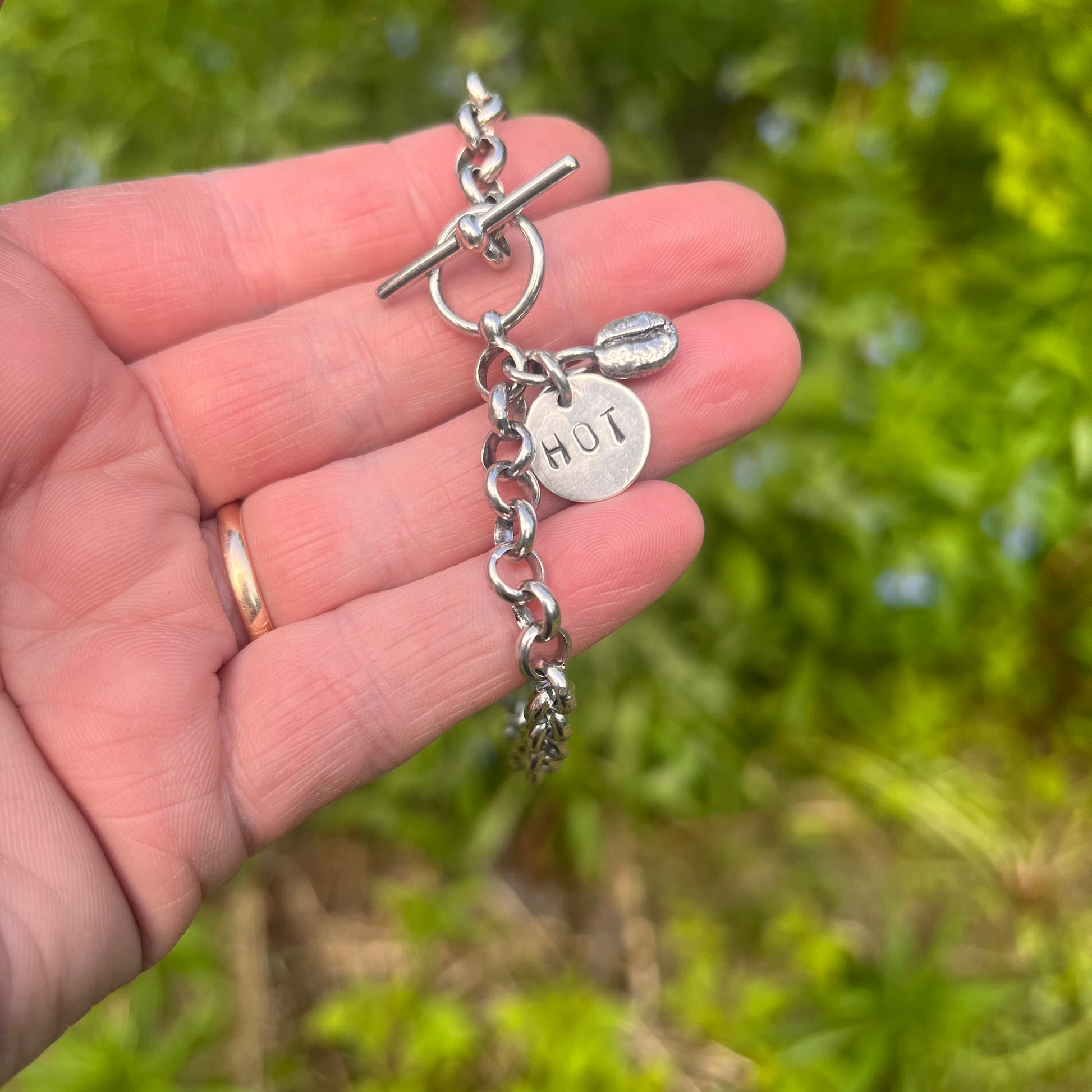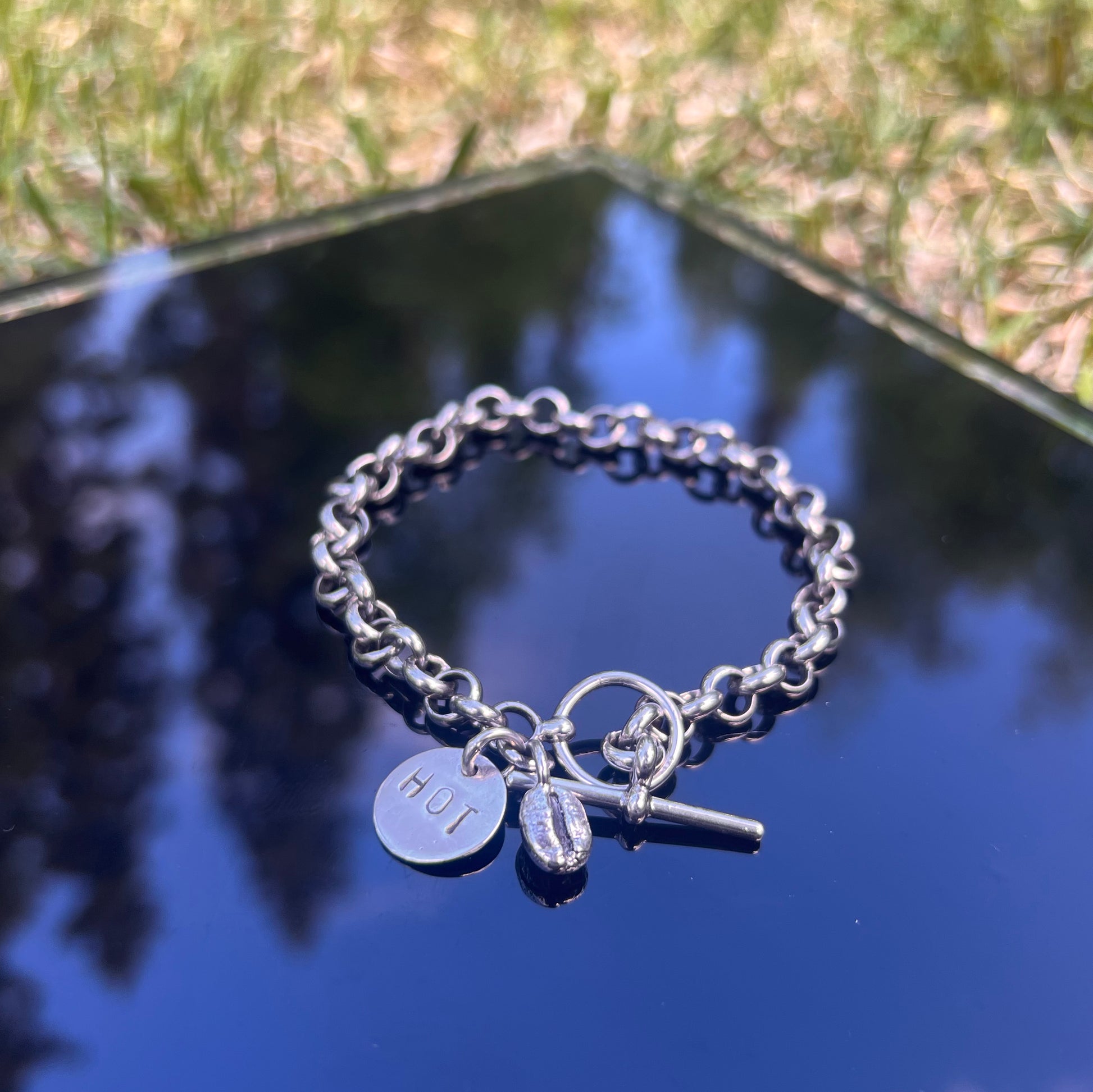Crafted with care and intention, this handmade rolo chain features a finely detailed sterling silver coffee bean charm—a symbol of energy, warmth, and connection. The sturdy yet elegant rolo links offer a timeless look, making this bracelet perfect for daily wear or thoughtful gifting.