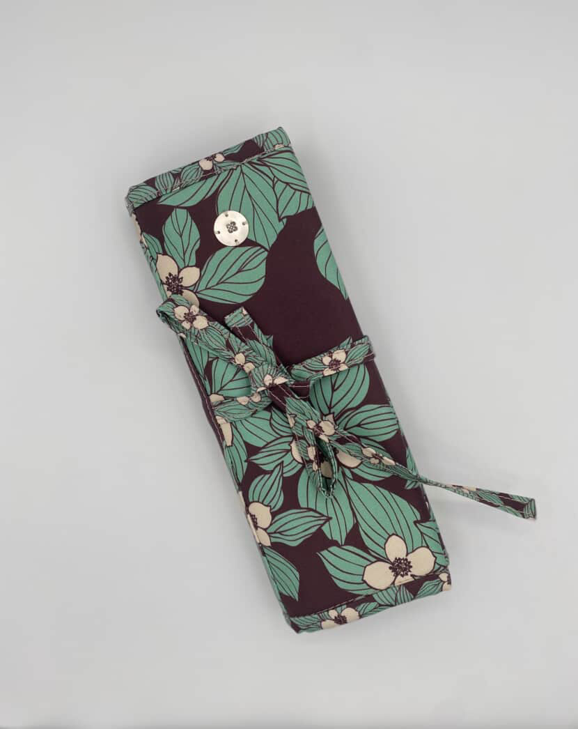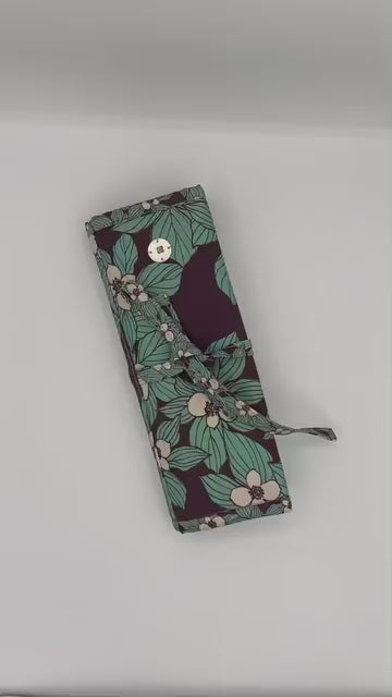 Double gate folded organizer with featured clear window zippered pocket. Four leather straps with holes for earring and necklace storage. Custom designed teal and purple dogwood fabric with antique brass hardware.
