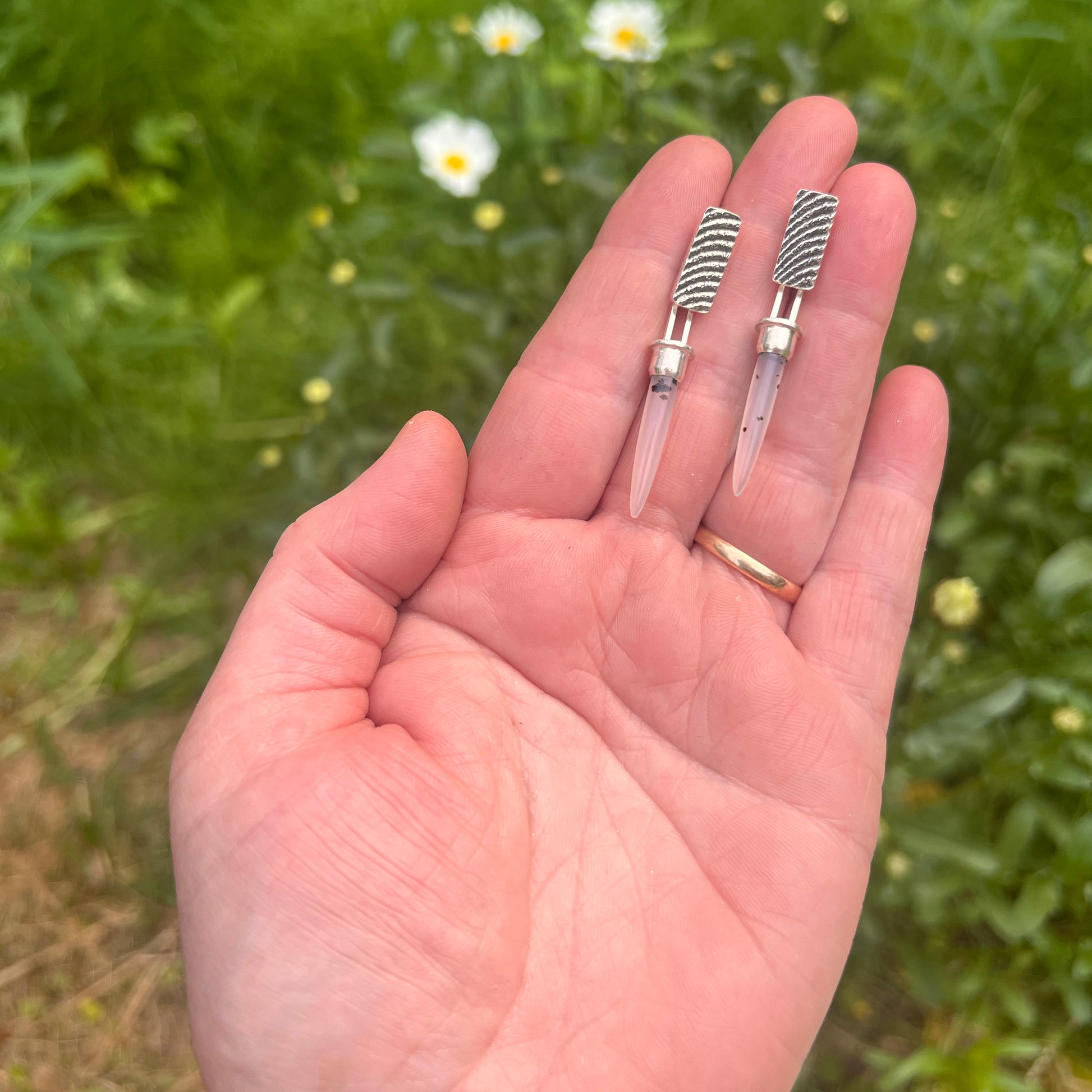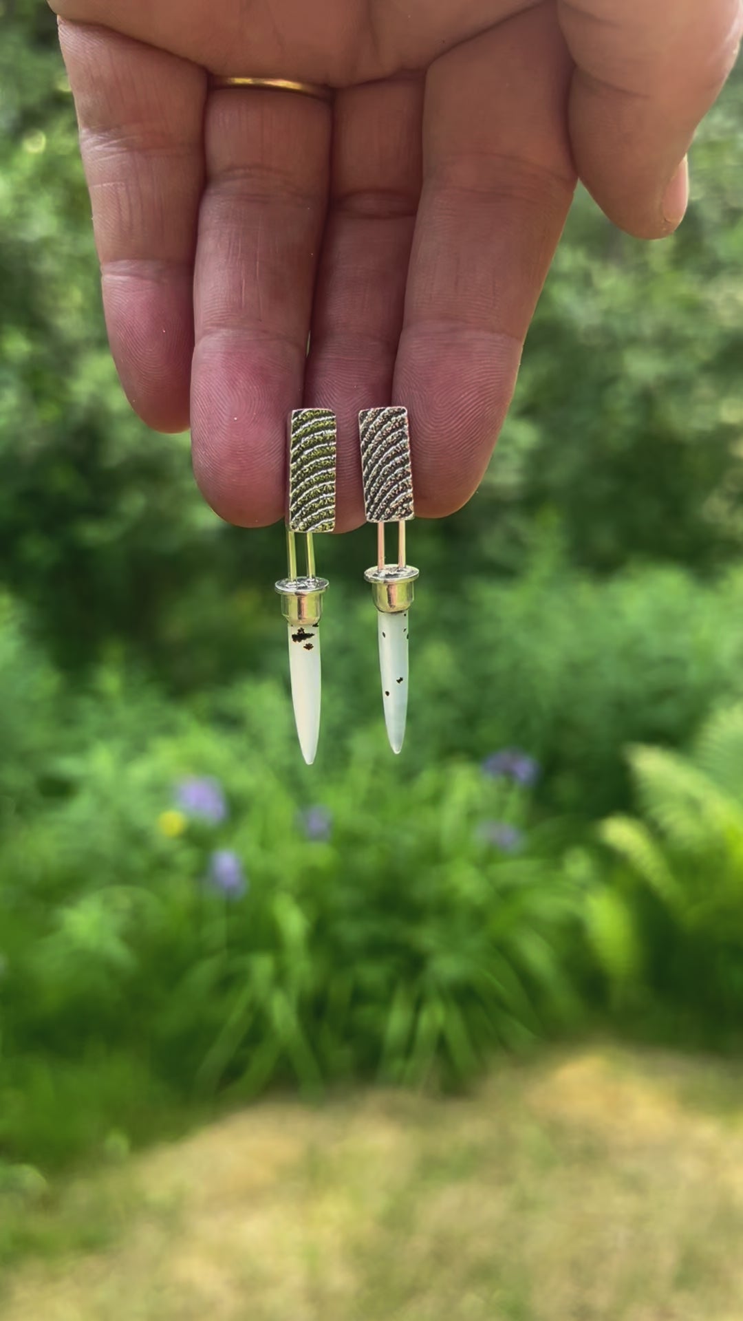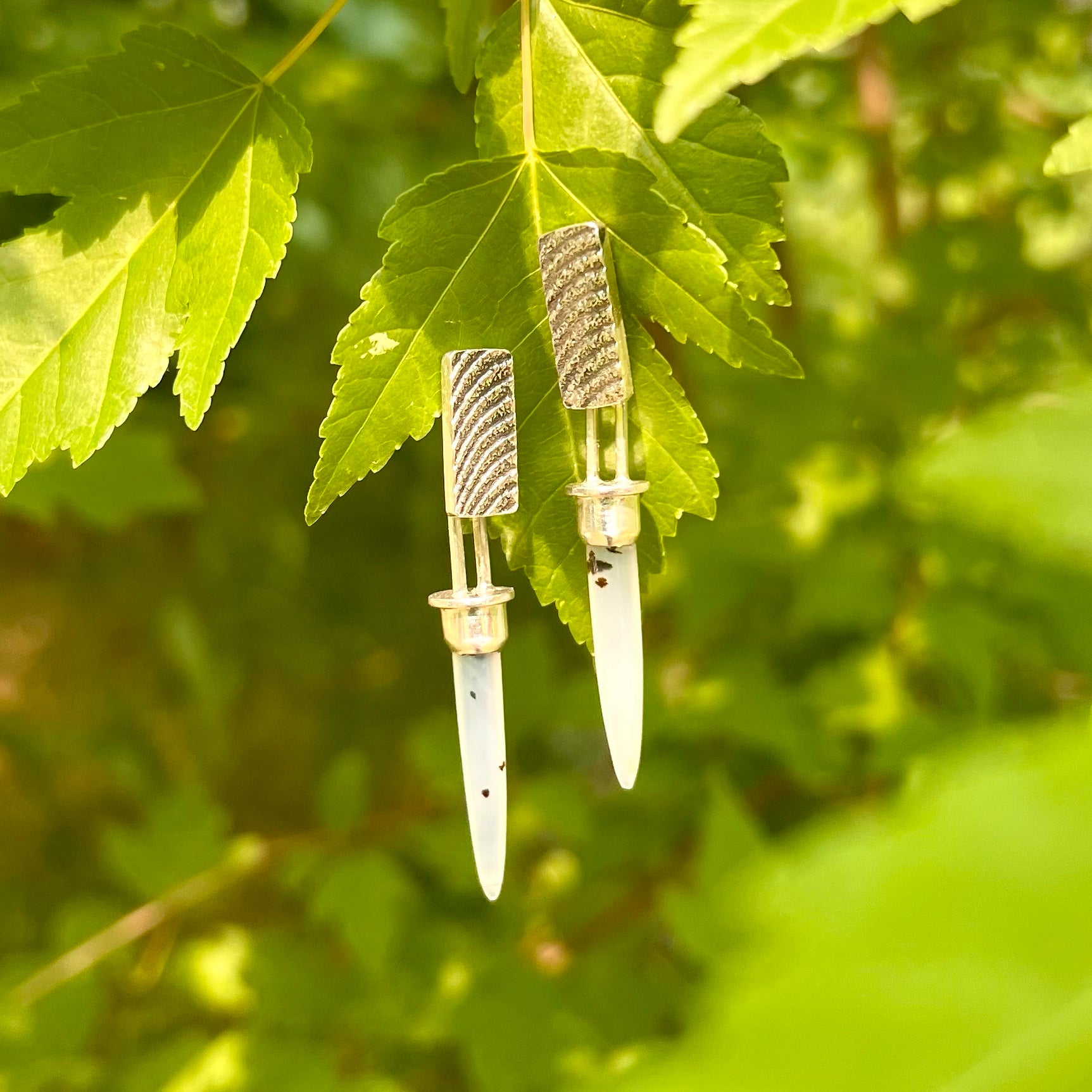Elevate your look with these one-of-a-kind Montana Agate spike earrings, handcrafted in sterling silver. Each agate spike contains unique patterns, with a subtle transparency that allows light to play. The silver post is textured using a traditional cuttlefish casting technique, adding organic ridges and depth that contrast the smooth delicate beauty of the stones.