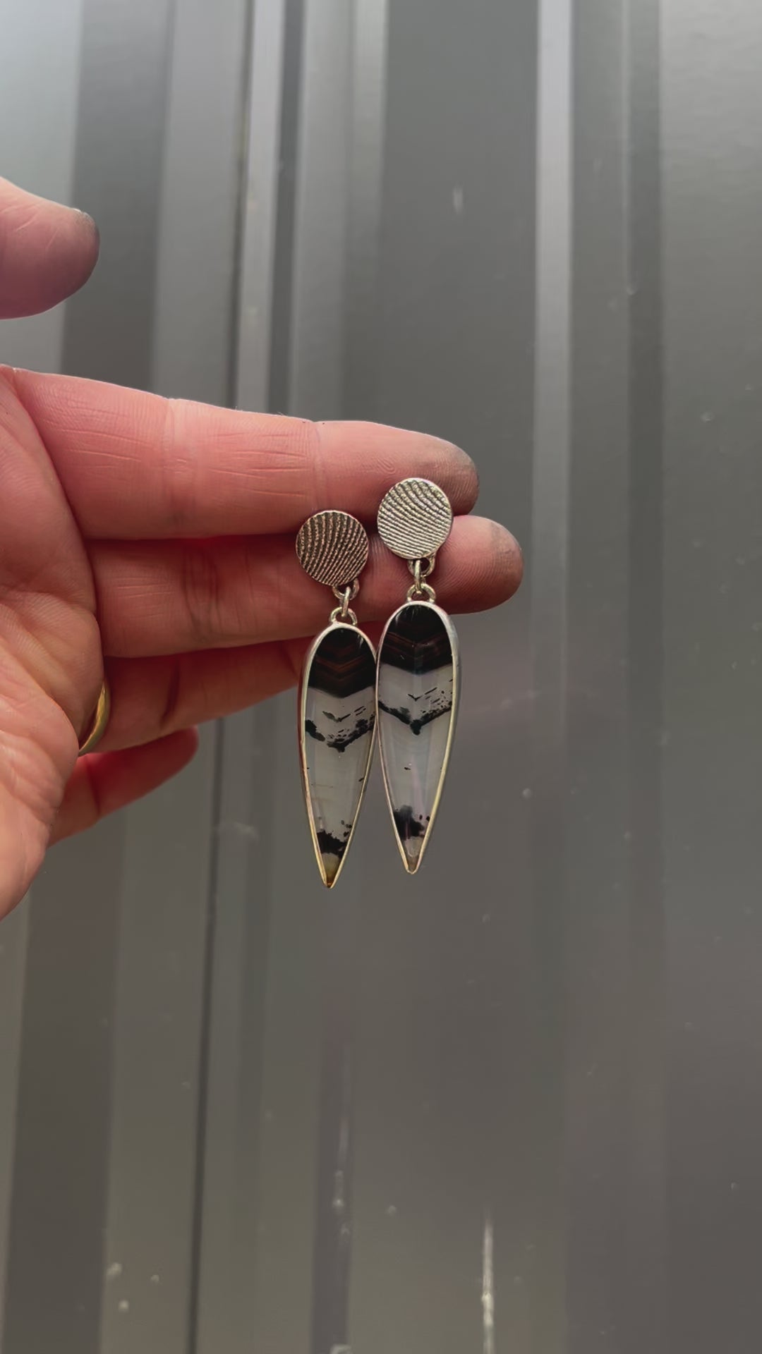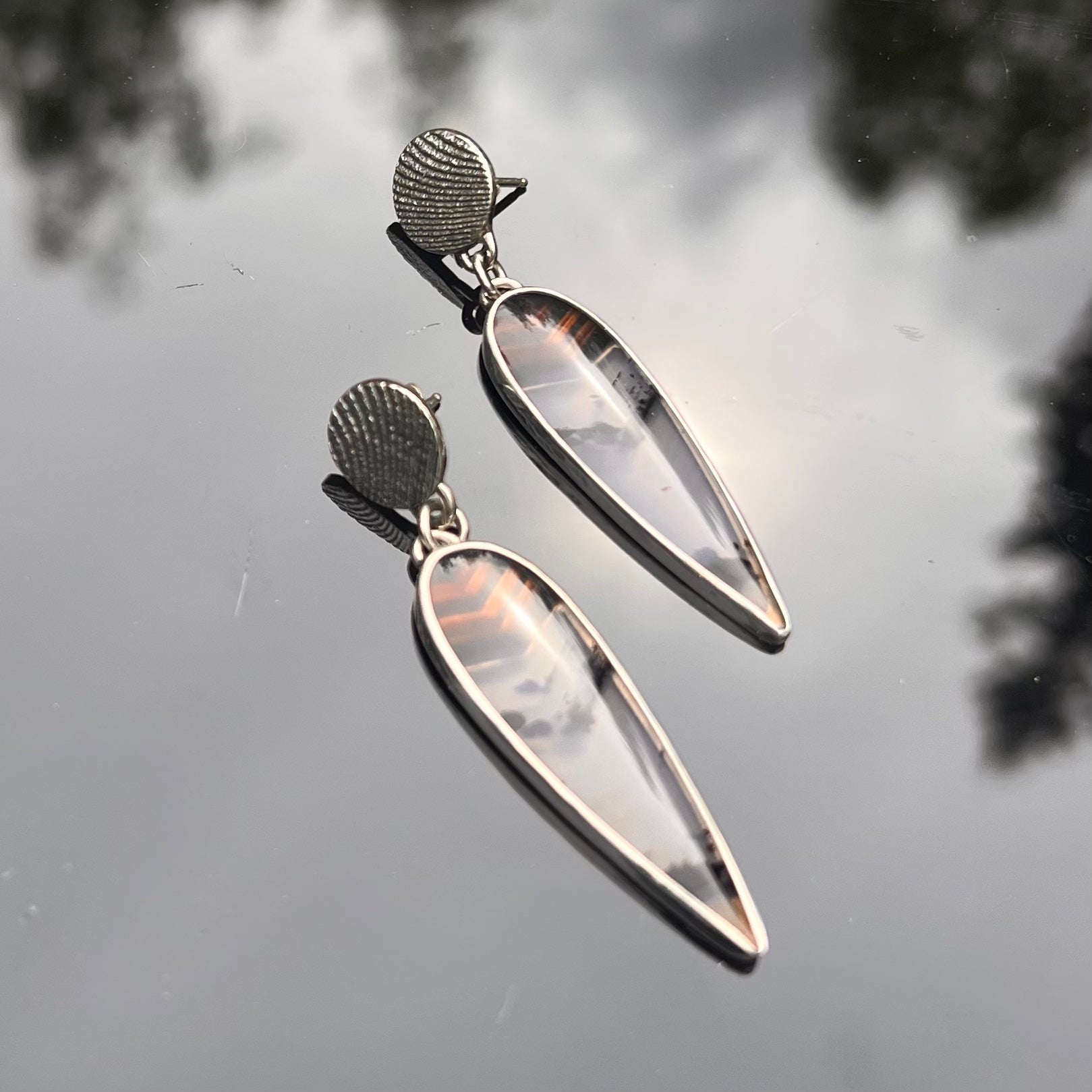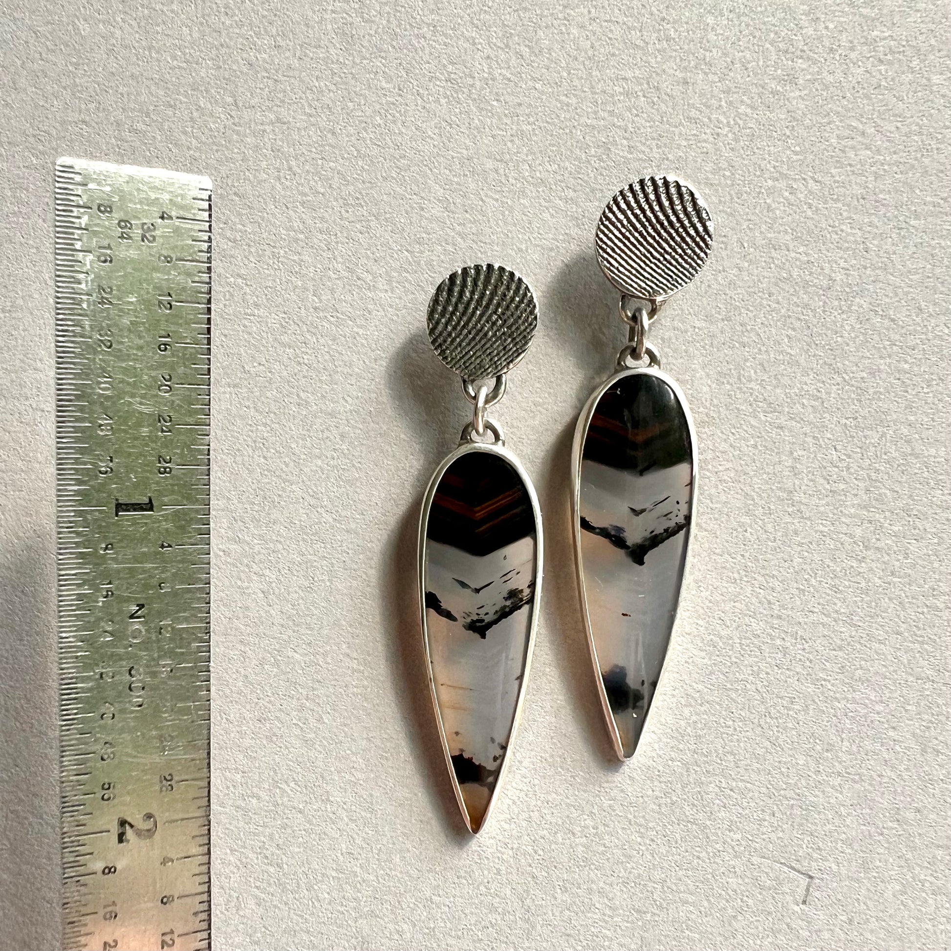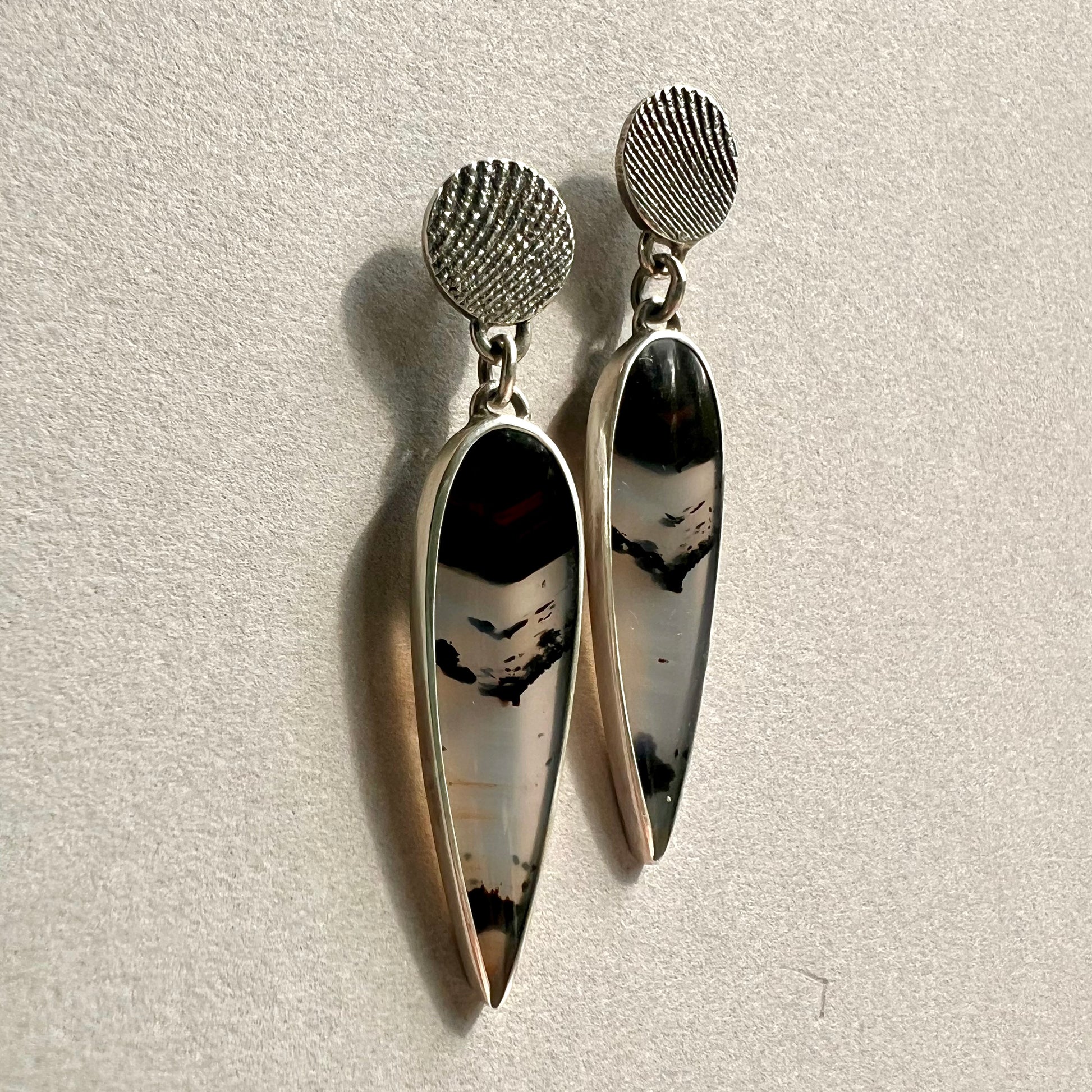 These handcrafted Montana agate earrings feature cuttlefish bone casting, a unique technique that creates organic, wave-like textures in the metal. These Montana agates were carefully selected for their distinctive banding and warm, earthy tones—ranging from translucent to deep chocolate brown. The cuttlefish casting process lends a one-of-a-kind, artisanal touch to the silver, echoing the natural patterns found in the agate itself. Elegant yet gritty, these earrings celebrate the fusion of raw nature and moody patina, making them a truly original accessory or meaningful gift.