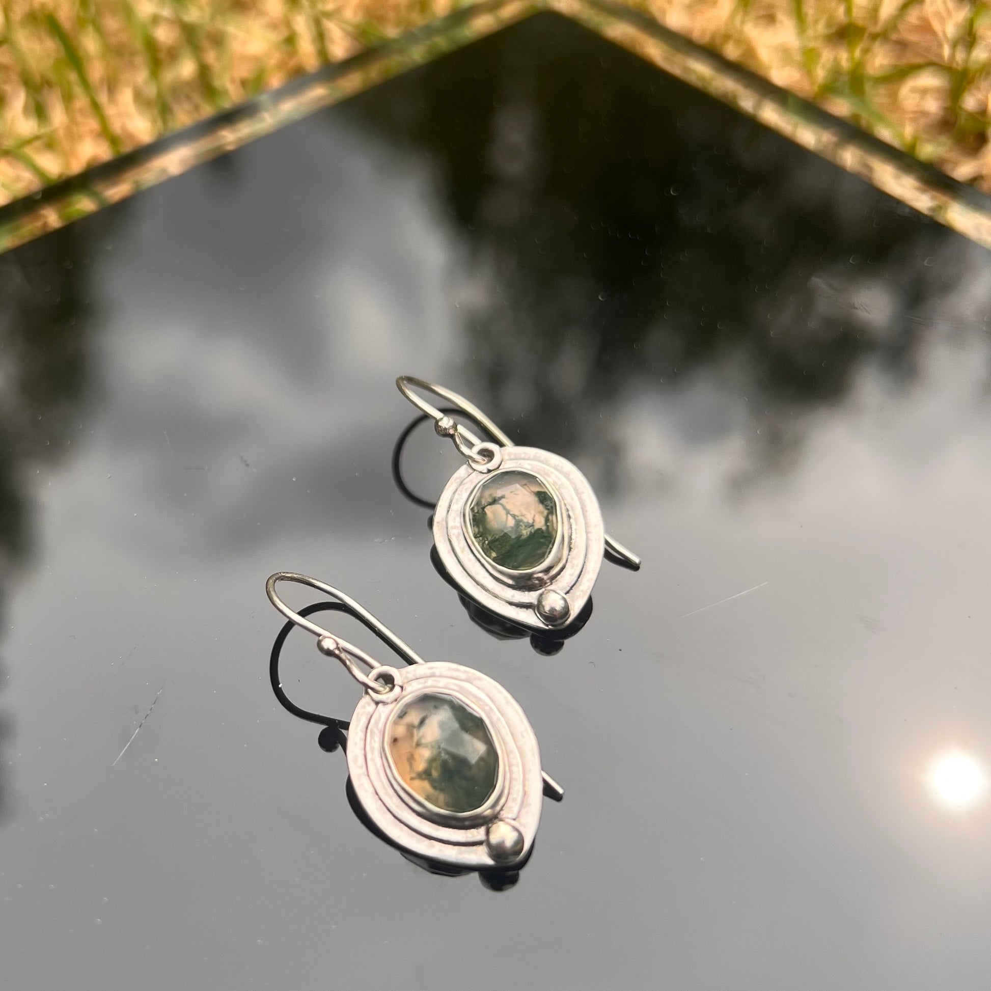 These handcrafted earrings feature natural moss agate gemstones, each with unique, earthy inclusions that resemble green moss. Set in solid 925 sterling silver, these earrings are light weight, easy to wear, and perfect for lovers of nature.