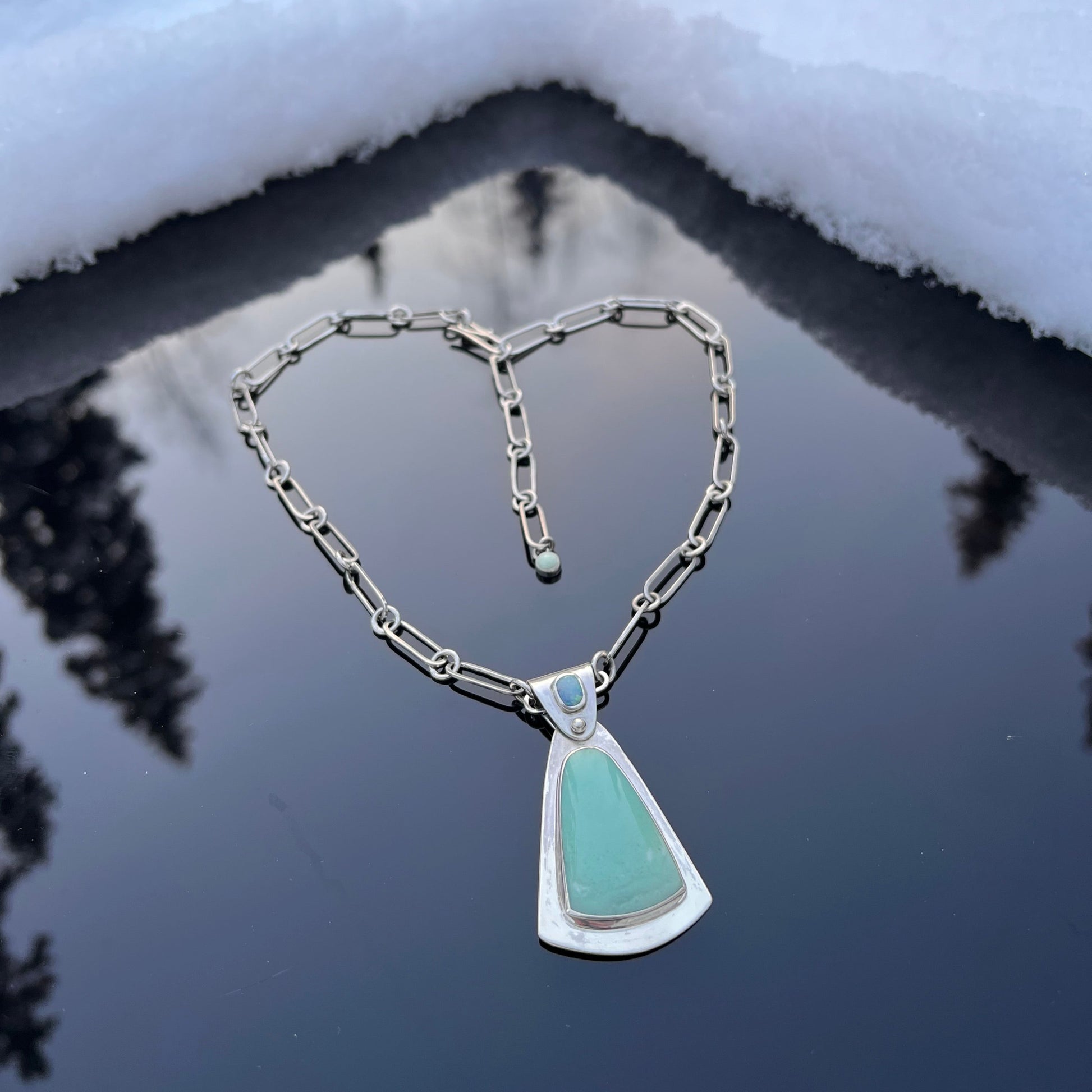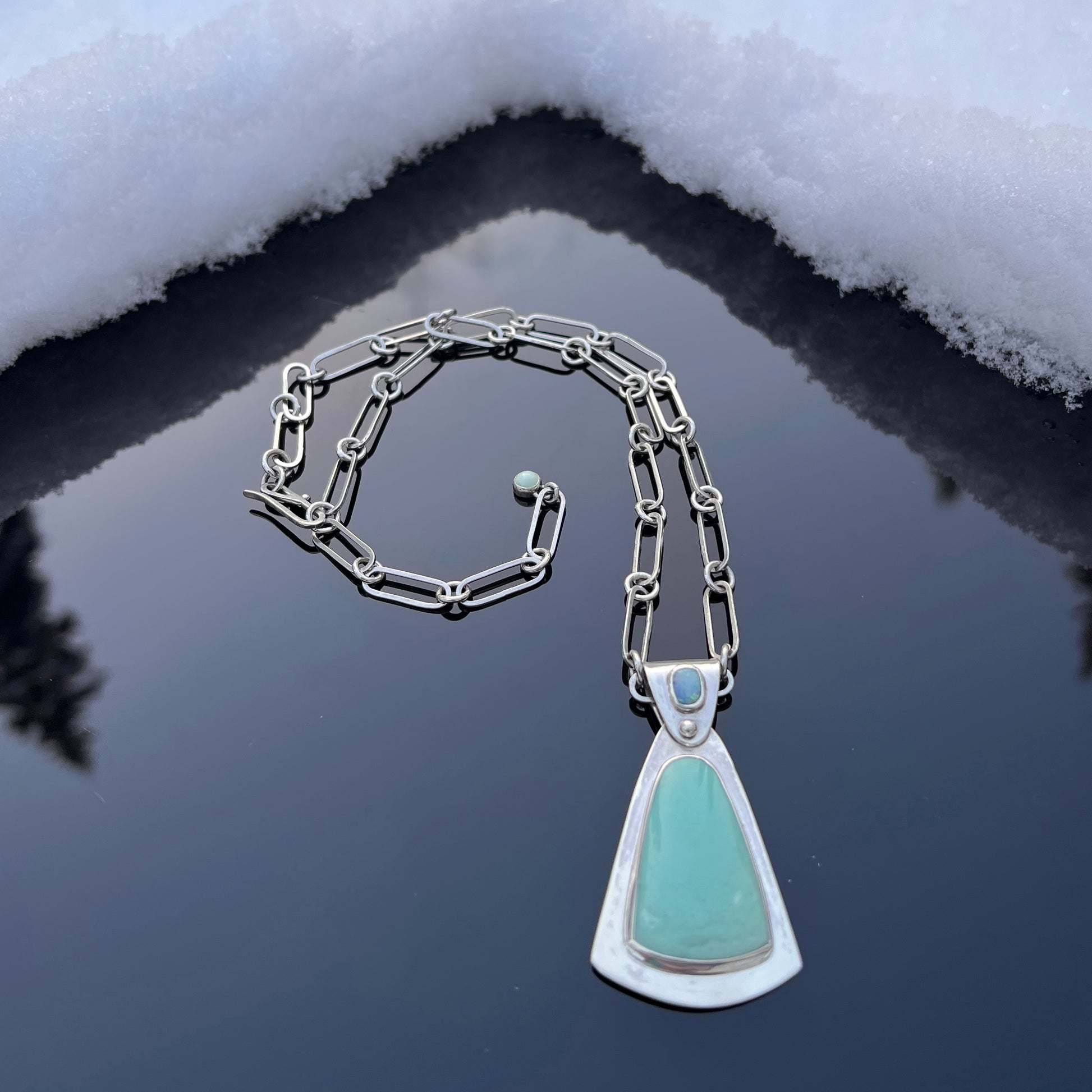 This large stunning Opal Wood stone maybe soft in color, but it makes its presence known. At 22 mm x 33 mm this stone will not be missed. It pivots from a bail set with an Australian Opal and hangs on a hand-made sterling silver paperclip chain. The chain is 21" long and the elongated links make this chain adjustable for your comfort. Set at the end is a delicate Prince Variscite, no matter the length you set your chain it will always look complete.