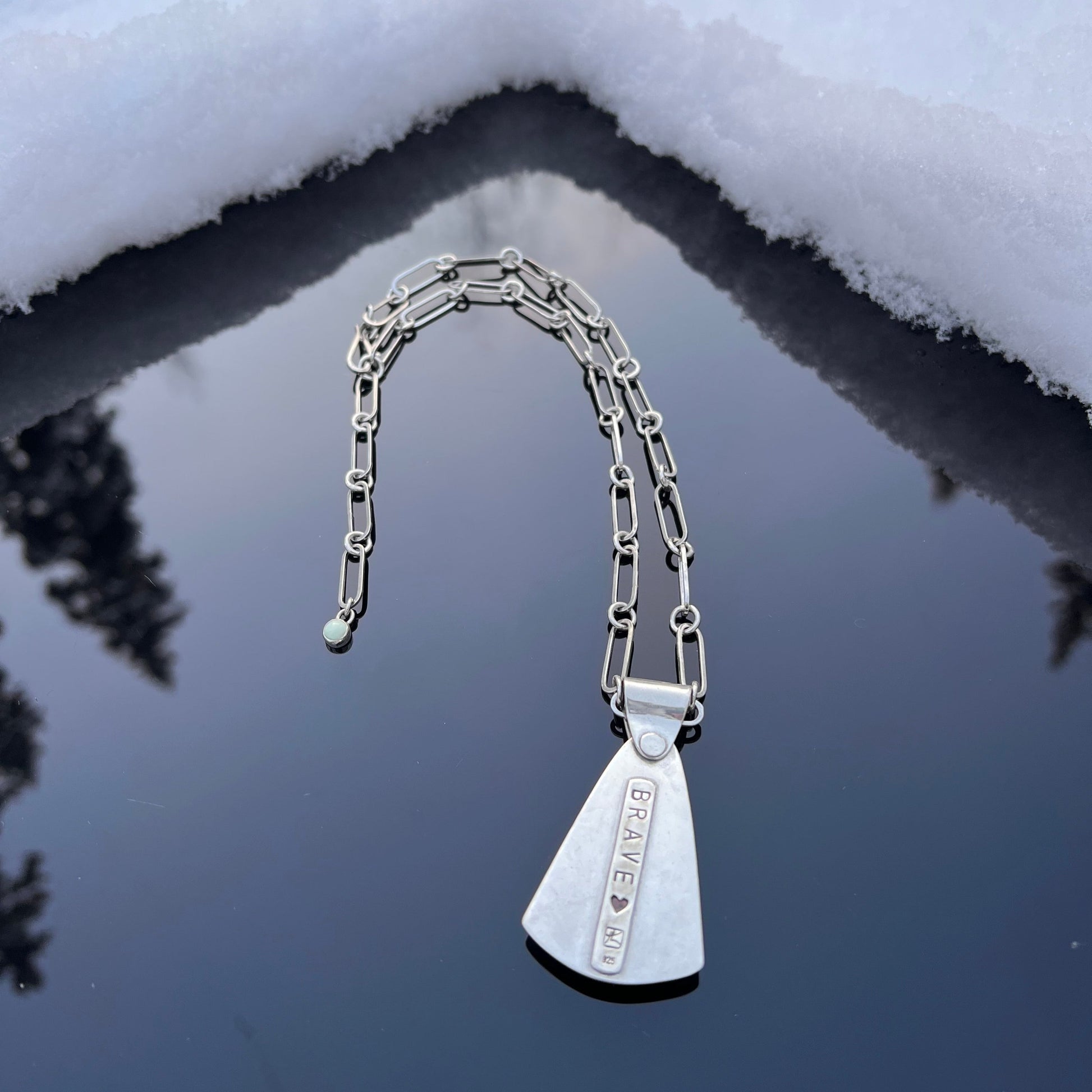 The back carries a message just for you. The word BRAVE, with the additional of a heart symbol, worn next to your heart, is a reminder to yourself that you are!
