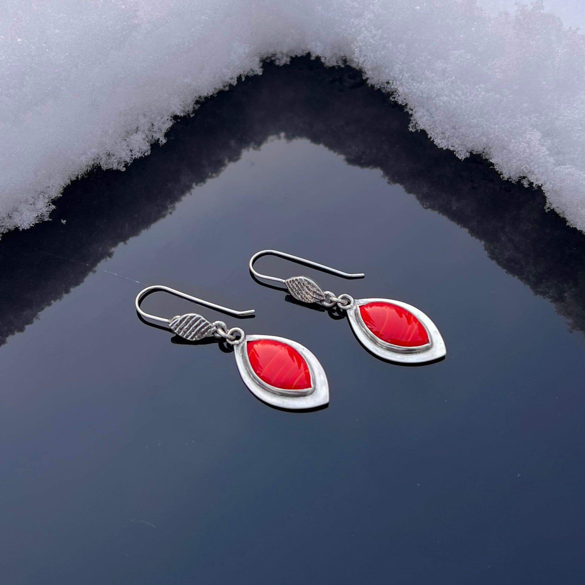 Fiery red rosarita laced with delicate yellow and orange banding. Hung from a sterling silver detail made from cuttlefish casting. A light patina brings out the cuttlefish detail, but does not take away from the shine and flash these earrings bring.