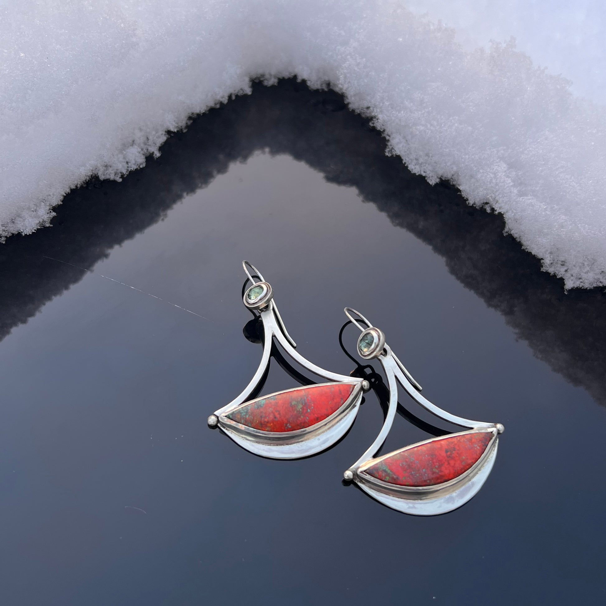 Sonoran Sunrise brings warm tones to to the cooler weather. From Sonora, Mexico, the Cuprite brings the red, while Chrysocolla adds pops of green. The elegant curved shape is suspended below a Madagascar Sapphire, adding movement and a flash of green/blue.